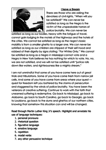 Martin Luther King S I Have A Dream Language Analysis And Pee Teaching Resources